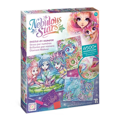 The Nebulous Stars - Dazzle-by-Number Rainbow lets kids create three dazzling masterpieces using micro-gems on adhesive templates. Follow the color-coded numbers for stunning results!